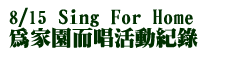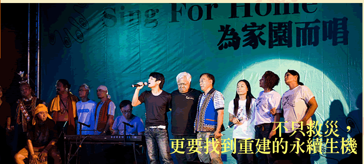 這是一場集各界的協助及眾人之力所辦成的演唱會。在不到一週的緊迫時間裡,台北市文化基金會及西門紅樓特別協助無償提供二樓的演出場地,讓來自台東的歌手,有了最好的表演舞台。雲門舞集、普訊及亞都麗緻飯店動員大量的志工,協助現場的服務、義賣以及導引,還有許多自動加入協助我們的朋友,當天的志工就多達七、八十人。節目製作、音響硬體廠商及負責轉播的原視,也在最短的時間內作出迅速的回應。每一個人都默默地以自己的方式,成就「Sing For Home為家園而唱」活動。