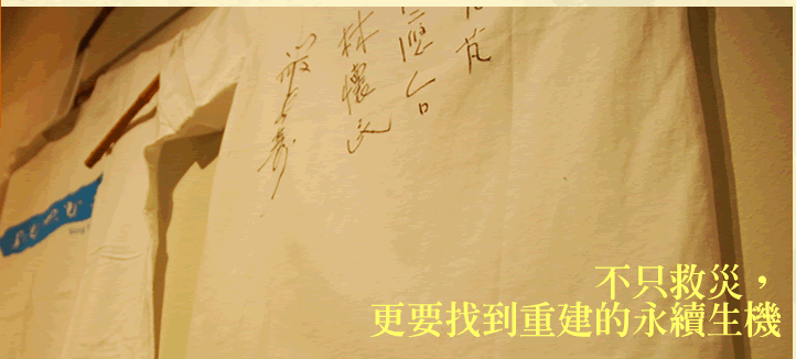 甫結束泰雅編織特展的野桐工坊,特別捐出結合編織的燈具,照亮重建之路。因九二一地震重建再起的森林紅茶,也提供義賣品響應,讓茶的溫潤,洗去惡水侵蝕的陰霾。現場義賣【Sing For Home 為家園而唱】白色紀念T恤,並特別播放由陳建年所唱的「重新開始」一曲,為重建家園之路,獻上深深的祝福。
